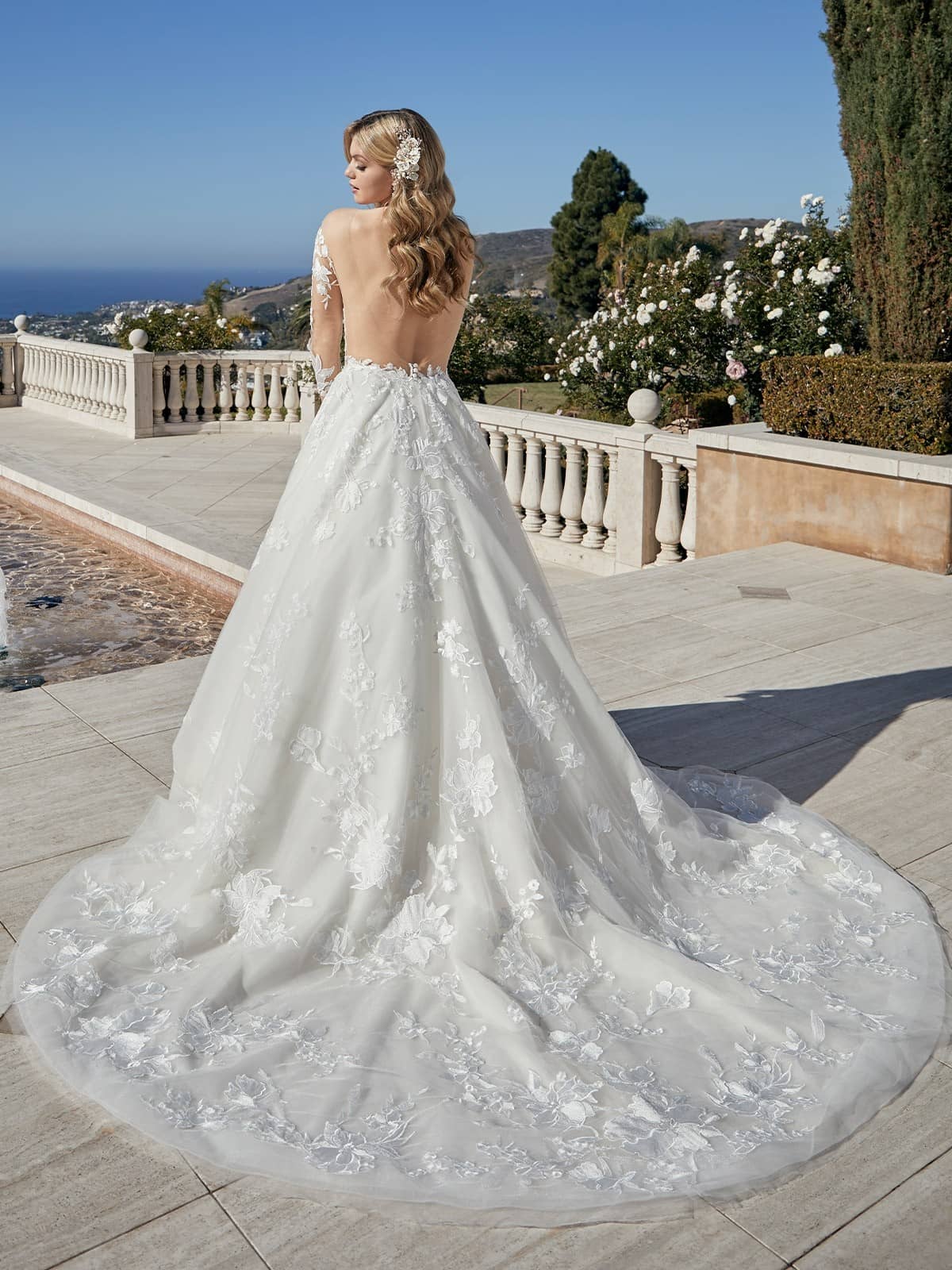 The V-neckline and illusion back of the Casablanca Lace A-Line Wedding Dress are standout features that provide the perfect combination of romance and modern elegance. The V-neckline elongates the bride’s neck, creating a flattering shape while drawing attention to the face and collarbones. This universally flattering neckline works well for all body types and is especially great for San Diego brides who want a romantic bridal look that feels both sophisticated and sexy.
