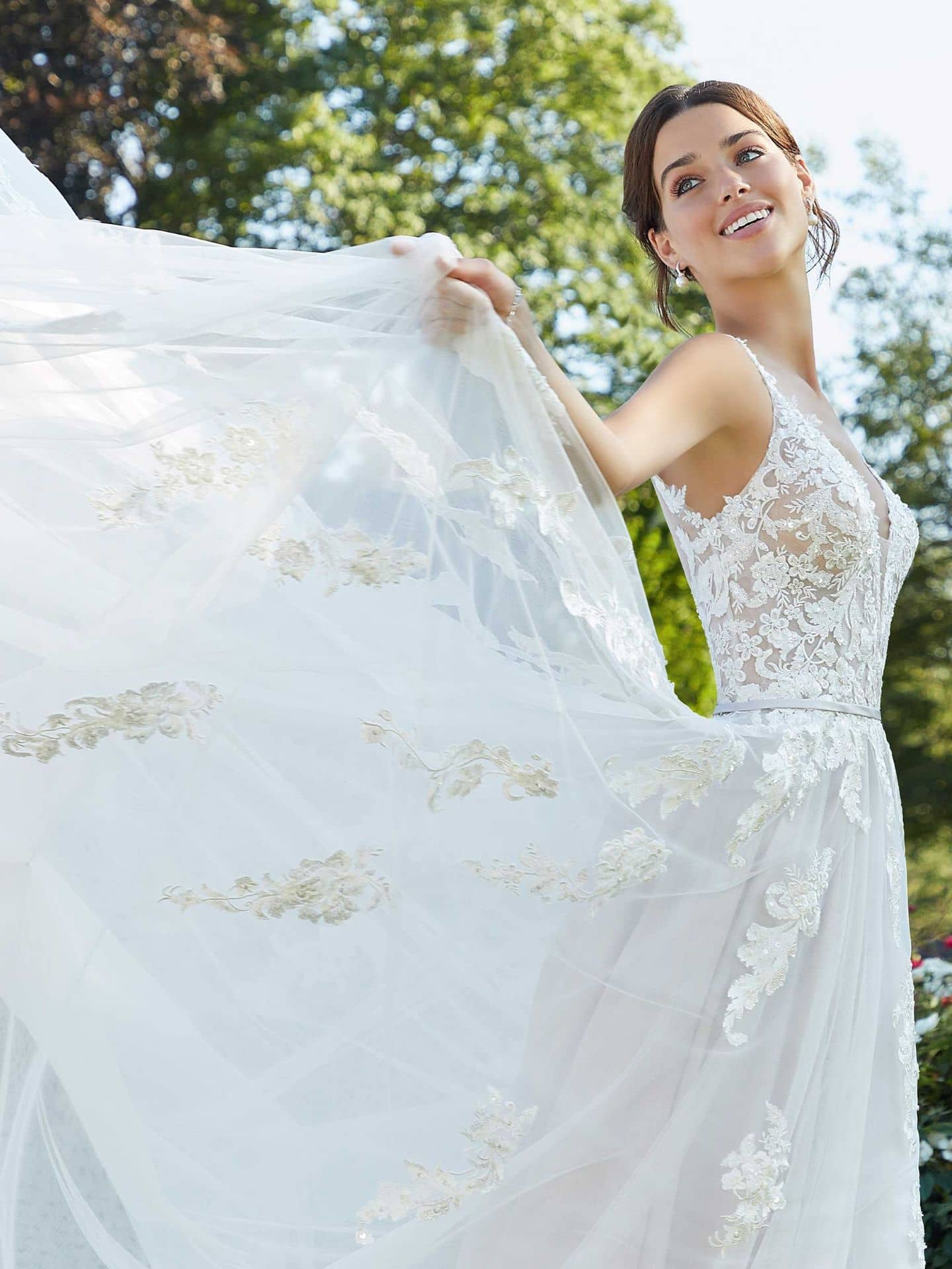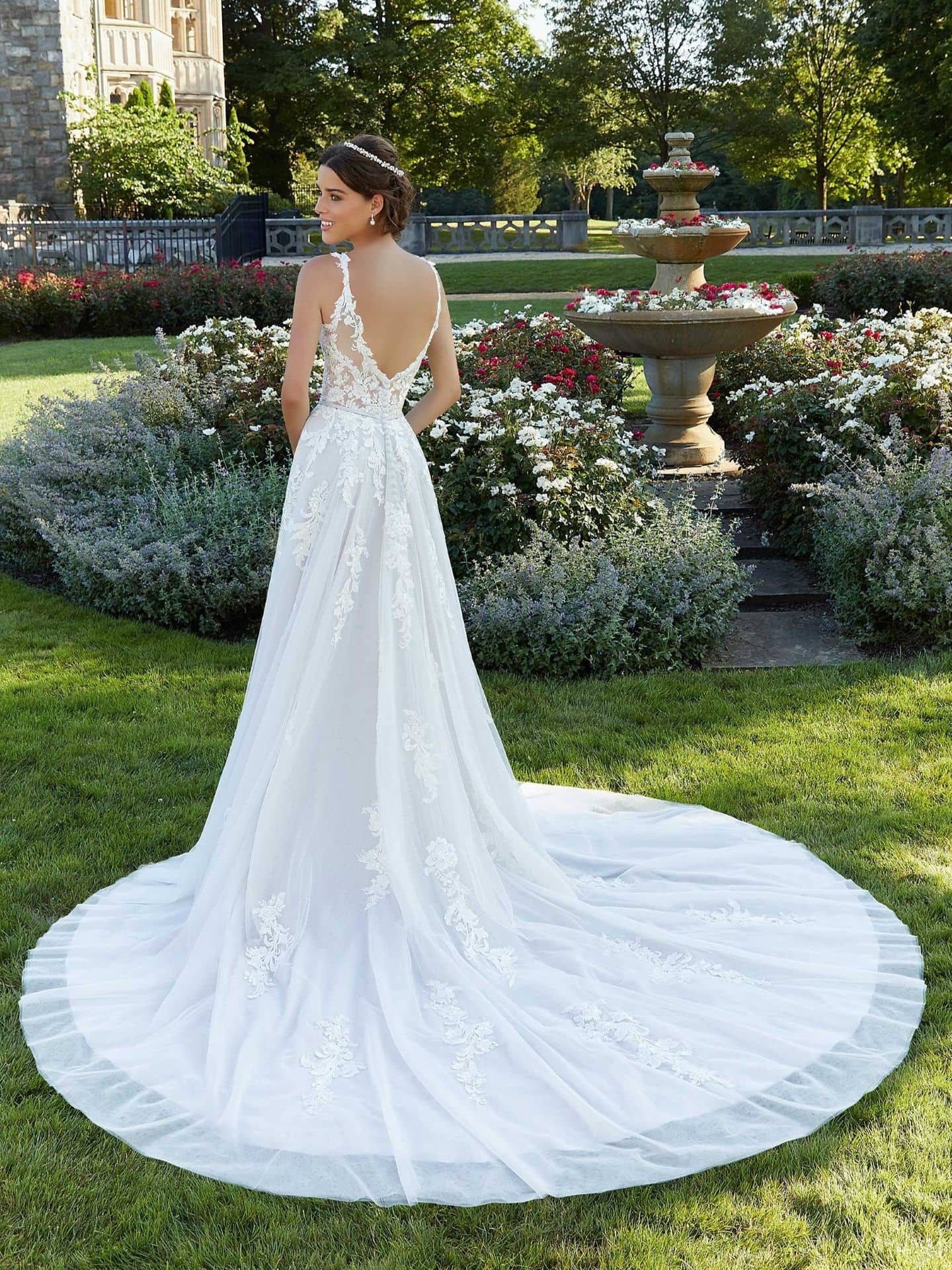 Morilee’s A-Line wedding dresses include a dramatic low back, adding a modern twist to a classic silhouette. The low back design offers an unexpected yet captivating detail, providing a flattering and sensual look that will leave a lasting impression. This feature is ideal for San Diego brides who want to add a touch of glamour and sophistication to their wedding day look. Paired with delicate lace and a V-neckline, the low back design creates a perfect balance of traditional elegance and modern allure.