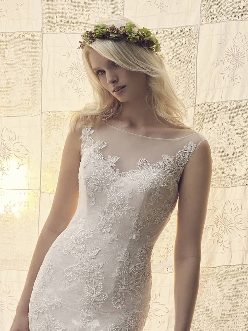 Discover Casablanca Fit-and-Flare Wedding Dresses in San Diego – Lace & Satin Gowns with Bateau Neckline, Illusion Back & V-Back Straps
