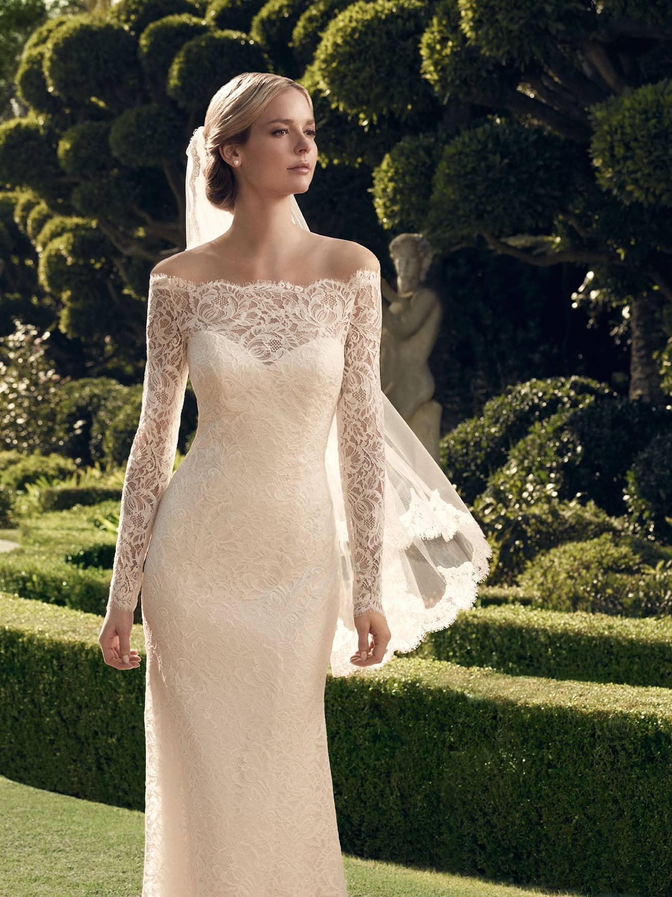 Shop Casablanca Boho Wedding Dresses in San Diego – Lace & Satin Sheath Gowns with Illusion Back, Sweetheart Neckline & Off-Shoulder Long Sleeves