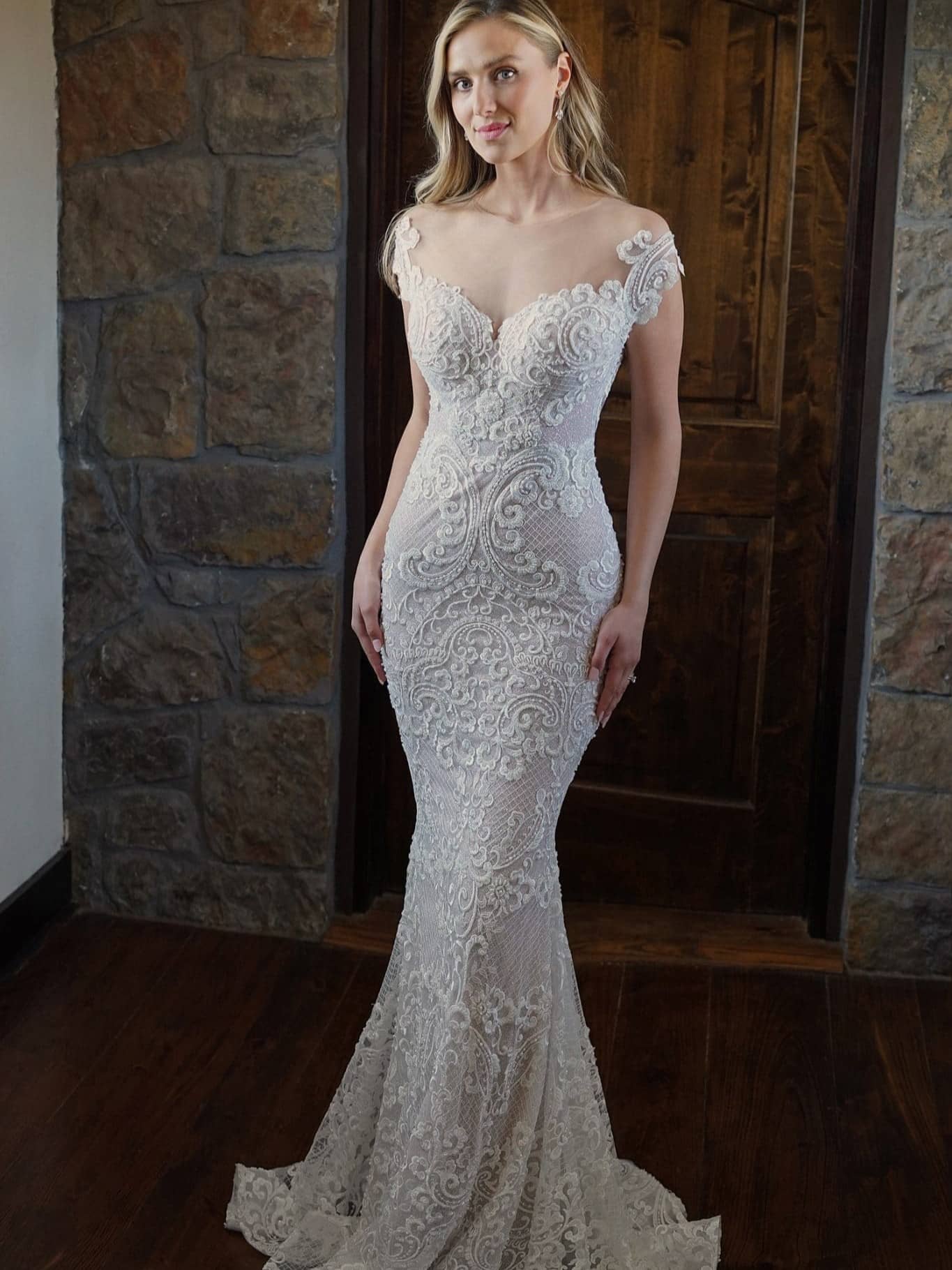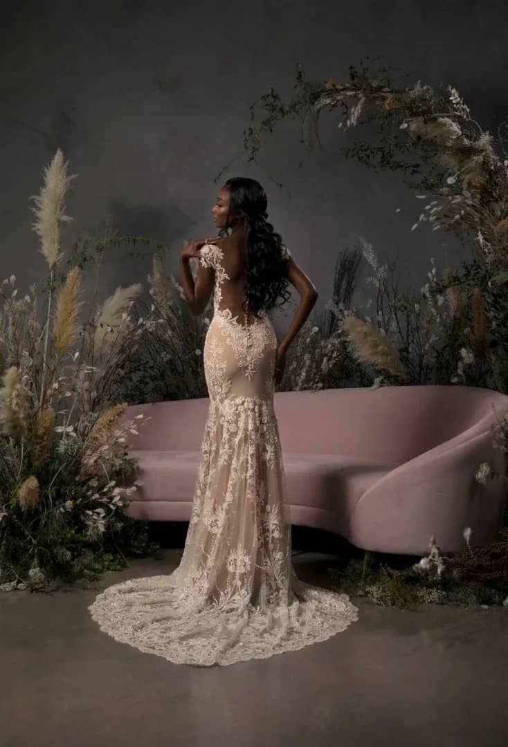 With a captivating neckline, detachable sleeves for versatility, a flawy skirt with a dramatic train, and an enchanting illusion open back, this gown is the epitome of timeless beauty and contemporary style. Your entrance will be unforgettable.