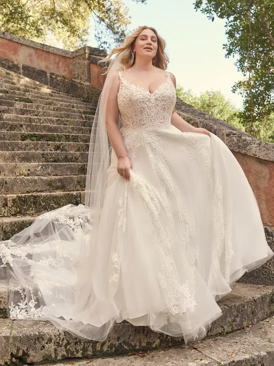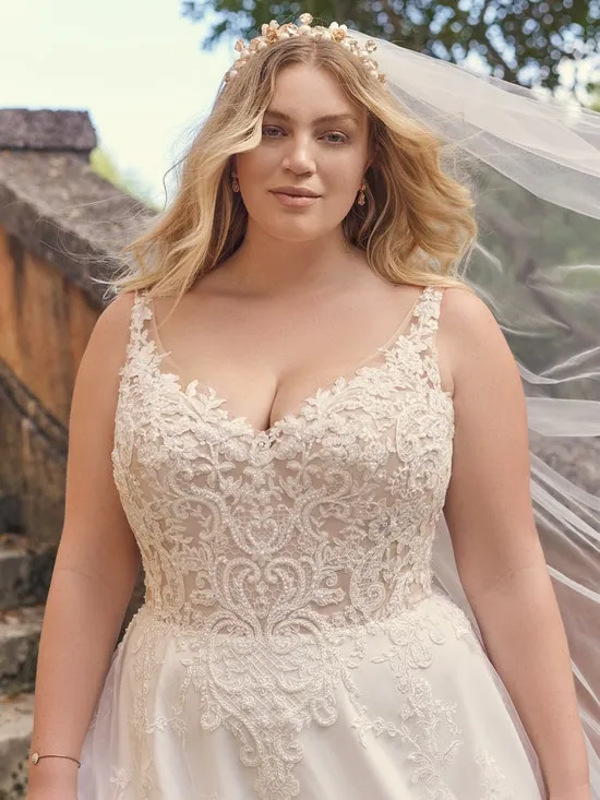 The Maggie Sottero A-Line Lace Wedding Dress offers a timeless blend of romance and elegance, making it a perfect choice for San Diego brides who desire a refined yet charming look. The illusion long sleeves create a delicate, airy feel, while the V-neckline enhances the natural curves of the bride. The lace detailing throughout the dress adds an intricate, textured element, ensuring that this gown stands out on your wedding day. Paired with the elegant V-back and straps for a secure fit, this wedding dress is designed to make brides feel confident, beautiful, and romantic.