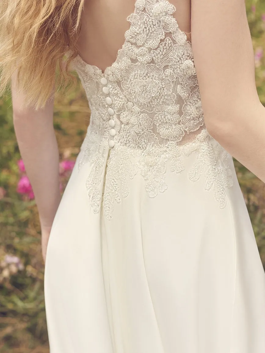 The Rebecca Ingram A-Line Lace Wedding Dress is an excellent choice for San Diego brides who want a perfect blend of modern style and timeless elegance. The A-line silhouette is one of the most flattering bridal designs, offering a comfortable and elegant fit for a variety of body types. Crafted from luxurious crepe, organza, and lace, this gown features intricate detailing that adds depth and texture. The V-neckline enhances the bride’s natural features, while the V-back creates a stunning and flattering view from all angles. With the straps providing ample support, this gown is ideal for brides who want both style and comfort. Whether you’re planning a beach wedding or a formal San Diego wedding, this gown ensures you’ll feel beautiful on your big day. Now available at a special price in our sample sale, it offers brides the opportunity to wear a high-end designer gown at an affordable price.