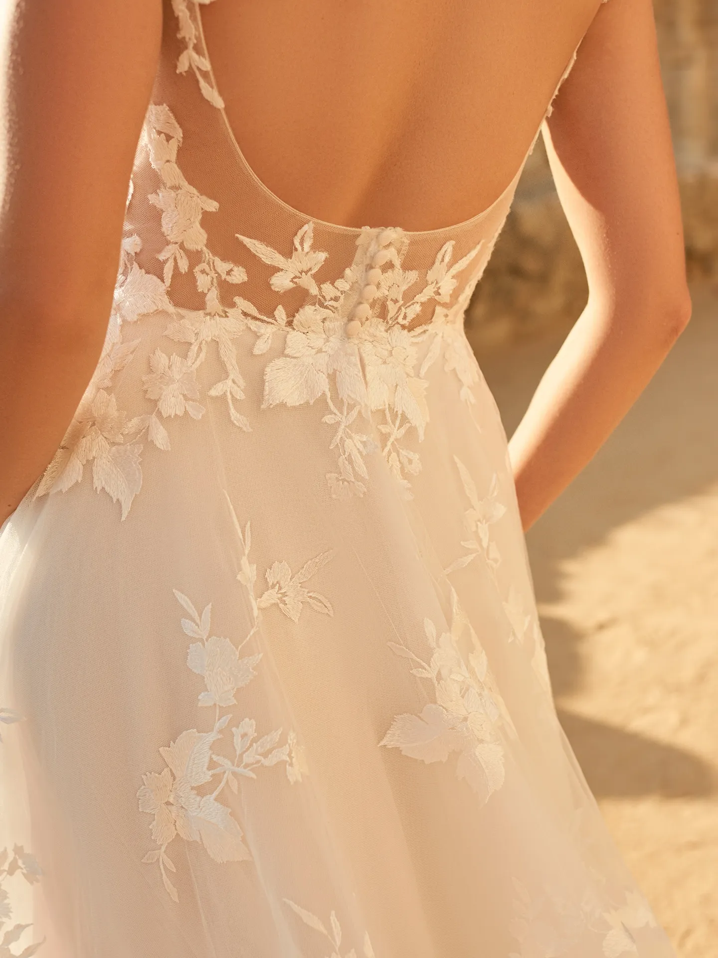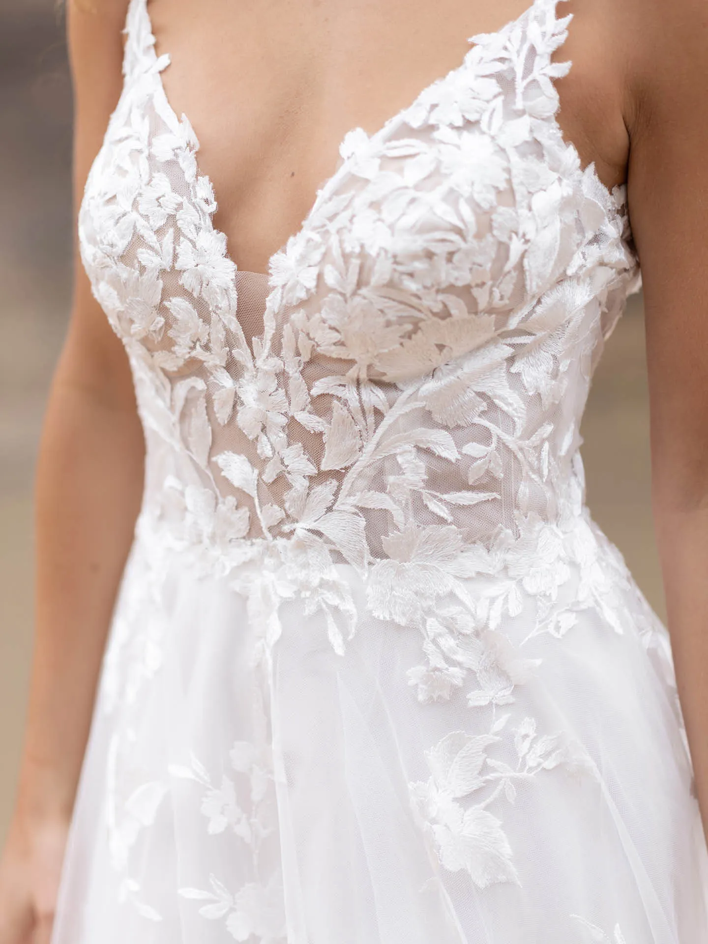 The Maggie Sottero Lace A-Line Wedding Dress is the epitome of elegance and sophistication, making it a top choice for San Diego brides who want a gown that combines classic beauty with modern touches. The A-line silhouette flatters all body types by gently skimming the waist and flowing gracefully to the floor. The lace detailing adds texture and romance, while the low back provides a touch of sensuality without sacrificing sophistication. The V-neckline elongates the neck and enhances the bride’s natural features, and the straps ensure a secure fit for all-day comfort. The tulle fabric creates a soft, ethereal feel, perfect for a romantic and timeless bridal look. Whether you are planning a grand ballroom celebration or a beachside ceremony, this gown will make you feel chic, confident, and radiant.
