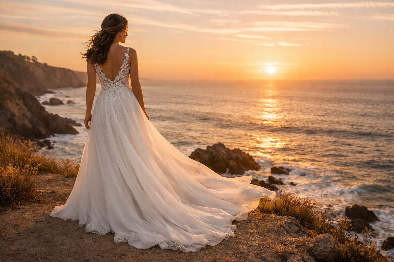 An outdoor wedding in Southern California is a breathtaking experience , the ocean breeze, the golden sunlight, the open landscapes, the effortless elegance of nature surrounding every moment. Your gown should enhance that beauty, not compete with it. Choosing the right outdoor wedding dress is about more than style; it’s about comfort, movement, structure, and confidence from the first step down the aisle to the last dance under the stars.